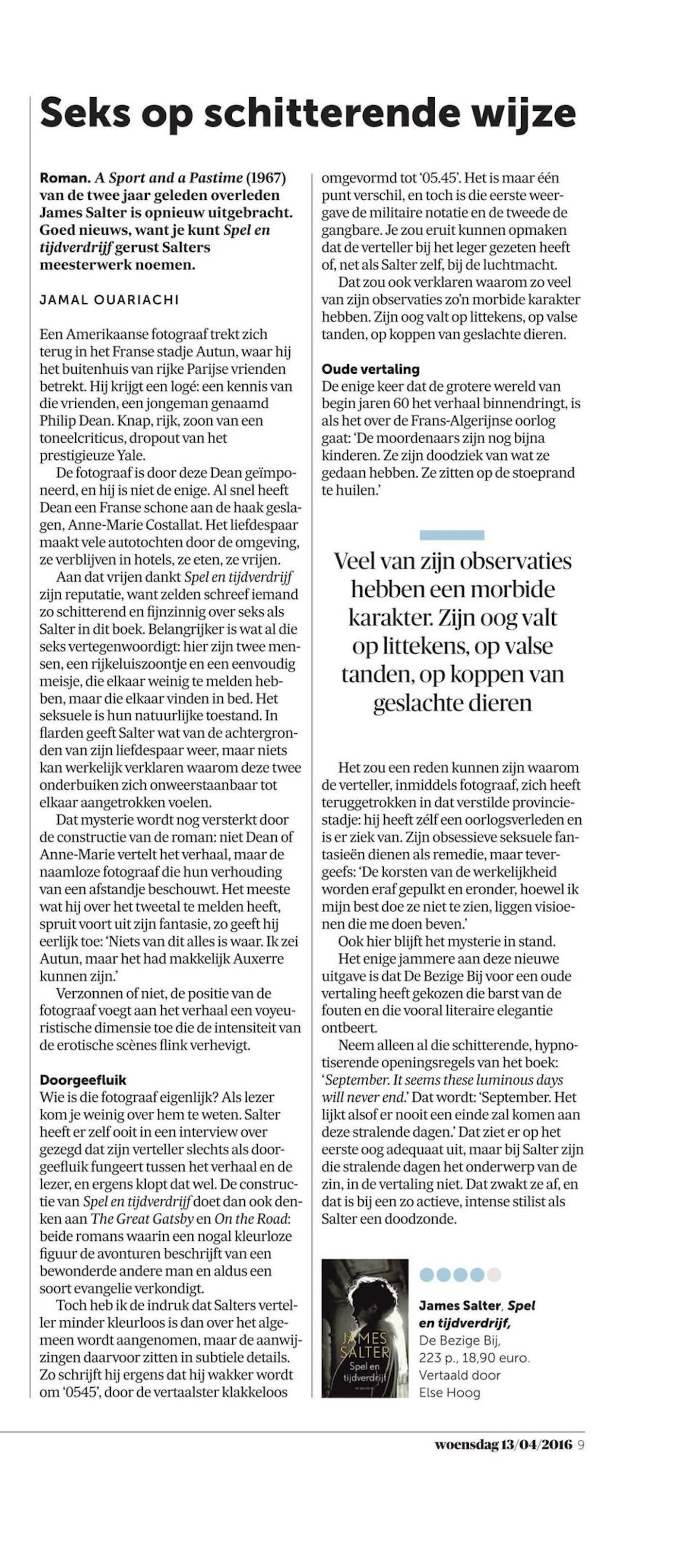 Recensie A Sport and a Pastime Jamal Ouariachi Geplaatst op 13 april 2016 door Jamal Ouariachi18 oktober 2016 Voor De Morgen besprak ik de heruitgegeven vertaling van James Salters meesterlijke A Sport and a Pastime. Hier te lezen. Overigens was ik twee jaar geleden in dezelfde krant heel wat minder enthousiast over Salters Light Years. Lees hier waarom.